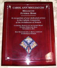 Carol Ann Migliaccio celebrated 25 successful years as Manager of the funeral home in 2001 and in 2011 she was honored as "Funeral Director of the Year for her continued outstanding service" by Archbishop John J. Myers and The Archdiocese of Newark.